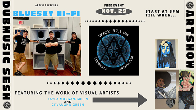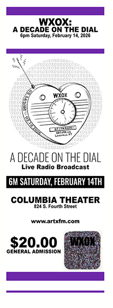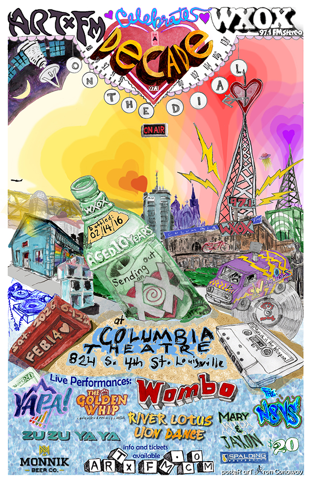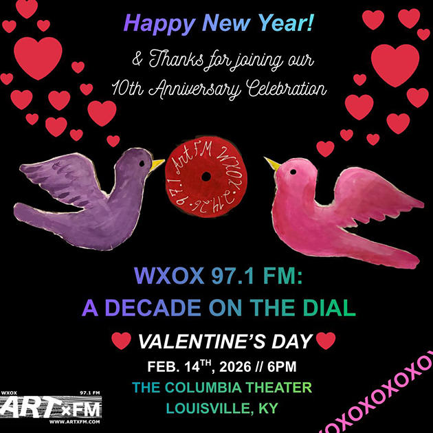 Please join us at the WXOX Studio on Saturday, Feburary 28th for a Planetary Alignment accompanied by the stellar sounds of DJ Kara, Sir Basil, Damien Martin, and Sean Selby. 8 PM till When??? 515 W. Breckinridge Street. Louisville, Kentucky 40203. Let's get the YEAR OF THE FIRE HORSE off to a magical start!!! ![]() Thanks to everyone who joined us for the 10th Anniversary of WXOX 97.1 FM! ![]() Poster by Aron Conaway A DECADE ON THE DIAL!!!!! This Valentine's Day the DJS of WXOX will be back at the historic Columbia Theater, 824 S. Fourth Street in downtown Louisville, to celebrate 10 YEARS ON THE FM AIRWAVES!!!! On our favorite neighborhood stage, we will feature a selection of bands from across Louisville's musical dial, spotlighting the DJs who volunteer their time at ART FM to produce an eclectic medeley of music, journalism, and ideas 24-hrs-a-day, 365 days-a-year. Join us as we celebrate everything and everyone involved in this dynamic community radio station, including the listeners we serve! THE LINE-UP INCLUDES: WOMBO The Golden Whip The N8VS Mary & Jaxon Yapa! ZuZu YaYa River Lotus Lion Dance WXOX DJ Showcase & MORE . . . GET TICKETS ONLINE HERE Collectible Paper Tickets from artist Jude Dean are available IN-PERSON at Better Days, Surface Noise and Guestroom Records. They are also available at Sugartown Vintage, and the Outsider Museum & Gallery. Please check websites for times and locations. This event will be BROADCAST LIVE on WXOX 97.1 FM, WXND 100.0 FM, artxfm.com, and free WXOX apps. Thank you to our Event Partners Spalding University, Monnik Beer, and Seiller Waterman Attorneys who help make special occassion happen! WE'RE RETURNING THE COLUMBIA THEATER!!!! CELBRATING 10 YEARS ON THE FM DIAL!!! VALENTINE'S DAY 2026! ![]() WXOX will be recognizing the convergence of their 10th Anniversary with Valentine’s Day, Mardi Gras, and the Lunar New Year. Wear your festive best! Dance, drink, and shop the silent auction under Muhammad Ali’s famous red bike. This is an all ages event starting at 6 PM. TICKETS ARE AVAILABLE HERE, in local record shops, and from your favorite WXOX DJs. All event proceeds benefit ART FM, a nonprofit organization dedicated to cultivating educational opportunities and live media experiences for international artists and members of the local community on the noncommerical radio station WXOX 97.1 FM. SPECIAL GIFTS for all ART FM MEMBERS who attend! Learn more about membership opportunities HERE We are still seeking event sponors this event, please CLICK HERE for more information. Local businesses that are interested in contributing to the Silent Auction can email gm@artxfm.com or upload directly through the SILENT AUCTION DONATION FORM. ********************************** ********************************** ********************************** THANKS TO EVERYONE FOR A WILD 2026! WISHING YOU A BRILLIANT 2026!!!! ![]() 2 Cold at the WXOX Radio Station (12/26/25) *FREE MUSIC EVENT* Join us for live performances and DJ sets featuring the Blue Sky Hi-Fi sound system! This is our gift to the 502 community, and a way to reign in the New Year with friends and fun. We're embracing the cold of the winter and the positive that it brings. We are 2 Cold Brrrrrrrrr Street parking available Music by: @smartereveryday_music, @harvestpluto, @dj.sotek, ![]() GET CONNECTED Listeners in the Louisville Metropolitian Area can tune us in on WXOX 97.1 FM and hear a simulcast over on WXND 100.9 FM! Thanks to advances in streaming technology, there are also many convenient ways to tune in to ARTxFM, no matter where in the world you may roam! CLICK PLAY on the player button found in the upper left-hand corner of this Website to listen on your computer. GET THE NEW & IMPROVED WXOX APP!!! SEARCH "WXOX" in the APP STORE & GOOGLE PLAY BLUE SKY HI-FI OUTERNATIONAL DEBUT! DUB SESSION + ART SHOW ![]() BLUE SKY HI-FI is a Kentucky Proud soundsystem constructed by Audio Carpenter Sean Selby and inspired by Sir Basil Outernational. This Saturday, November 29th at 8 PM marks the 1st occasion this custom stack will be audible to the general public!!! Selectors DJ Selby and Sir Basil will be joined by Brom and Evan Wilson to bring the Blue Sky Hi-Fi to life with a variety of Dub and Electronic music . Artwork by Kayla Morgan-Green and Ci'Vaughn Green will adorn the walls! For the full effect, please join us at the ART FM studio -- located at 515 W. Breckinridge Street in downtown Louisville on 11.29 begining at 8 PM. For those who cannot attend, the evening's music will also be broadcast locally on WXOX 97.1 FM and worldwide on www.artxfm.com. WXOX T-SHIRT & STICKER DESIGN CONTEST ART FM will be celebrating 10 YEARS of broadcasting on WXOX 97.1 FM on February 14, 2026! We are currently seeking new T-Shirt and Sticker Designs to help us commemorate the occasion. We know you are creative and would love to see what you can do! * * * CLICK FOR MORE INFO * * * SUBMIT DESIGNS BY DECEMBER 1, 2025